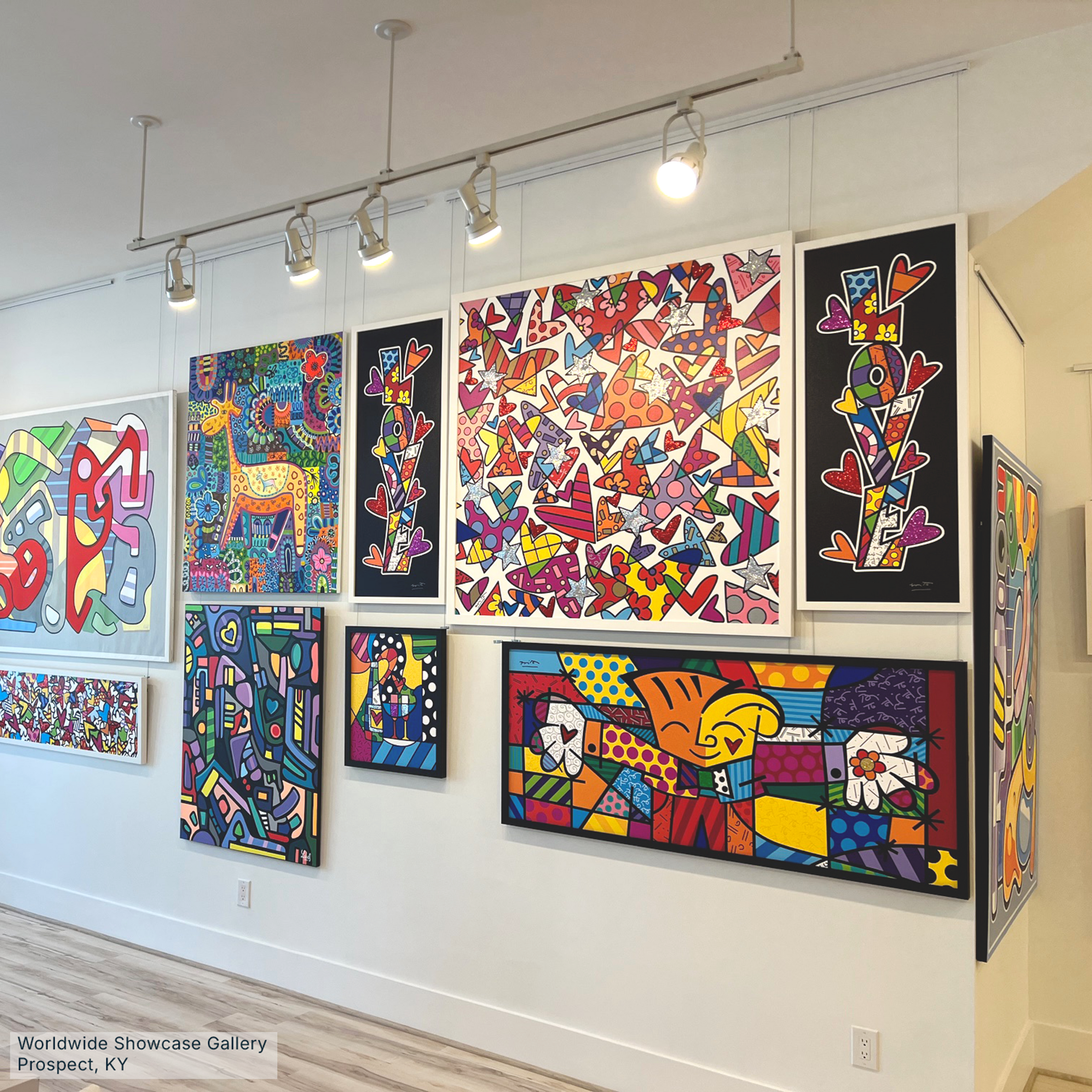 About 20 paintings displayed in a salon-style grouping, hung on a gallery art hanging system